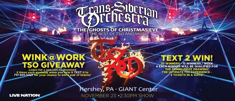 You could win 1 of 30 Pairs of TRANS SIBERIAN ORCHESTRA tickets to THE WINK 104 HOLIDAY SHOW on November 23rd at Giant Center at 2:30, plus you'll be qualified for The Grand Prize of THE ULTIMATE TSO EXPERIENCE! 6 tickets in a suite with Food and Drinks.